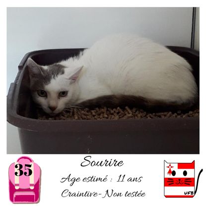 URGENCE EUTHANASIE ! Sourire est une femelle de 11 ans craintive (un comportement normal en fourrière) qui vous attend dans une fourrière du 35. ATTENTION SORTIE AU PLUS TARD LE 04/09/2020 (avant euthanasie) ! Pour adopter, c'est facile : ➡️ On se rend sur la page facebook d'Urgence Fourrière de Bretagne (UFB) -> https://www.facebook.com/sosfourrieresbreizh/ ➡️ On vient en message privé sur la page UFB ➡️ On remplit le questionnaire ➡️ Si le questionnaire est validé, on se rend disponible pour la pré-visite ➡️ On se rend aussi disponible pour venir chercher le loulou en fourrière Les chats sortent de fourrière primo-vaccinés et identifiés. Restera à charge de l’adoptant le rappel de vaccin et la stérilisation qui est OBLIGATOIRE. Les femelles en fourrière ayant été trouvées dans la rue, il y a fort à parier que nombre d'entre elles en âge de l'être soient gestantes ... ---- A PROPOS D'URGENCE FOURRIERE DE BRETAGNE (UFB) Nous sommes un COLLECTIF d'ASSOCIATIONS DE PROTECTION ANIMALE (qui rassemble notamment Moustaches et Compagnie, Bêtes de Scène, les Pachas, Chats Libres de Berné, etc, etc....) Le BUT de ce collectif d'associations est donc de SORTIR ces animaux des fourrières surchargées en les faisant ADOPTER de manière LEGALE par des familles ou en leur trouvant des FAMILLES D'ACCUEIL lorsque des places en association se libèrent.