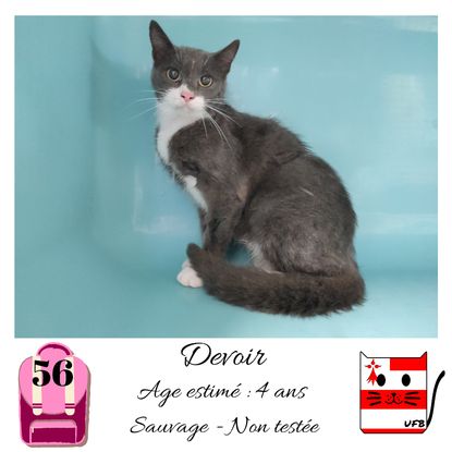 URGENCE EUTHANASIE ! Devoir est une femelle de 4 ans sauvageonne (un comportement normal en fourrière) qui vous attend dans une fourrière du 56. ATTENTION SORTIE AU PLUS TARD LE 04/09/2020 (avant euthanasie) ! Pour adopter, c'est facile : ➡️ On se rend sur la page facebook d'Urgence Fourrière de Bretagne (UFB) -> https://www.facebook.com/sosfourrieresbreizh/ ➡️ On vient en message privé sur la page UFB ➡️ On remplit le questionnaire ➡️ Si le questionnaire est validé, on se rend disponible pour la pré-visite ➡️ On se rend aussi disponible pour venir chercher le loulou en fourrière Les chats sortent de fourrière primo-vaccinés et identifiés. Restera à charge de l’adoptant le rappel de vaccin et la stérilisation qui est OBLIGATOIRE. Les femelles en fourrière ayant été trouvées dans la rue, il y a fort à parier que nombre d'entre elles en âge de l'être soient gestantes ... ---- A PROPOS D'URGENCE FOURRIERE DE BRETAGNE (UFB) Nous sommes un COLLECTIF d'ASSOCIATIONS DE PROTECTION ANIMALE (qui rassemble notamment Moustaches et Compagnie, Bêtes de Scène, les Pachas, Chats Libres de Berné, etc, etc....) Le BUT de ce collectif d'associations est donc de SORTIR ces animaux des fourrières surchargées en les faisant ADOPTER de manière LEGALE par des familles ou en leur trouvant des FAMILLES D'ACCUEIL lorsque des places en association se libèrent.
