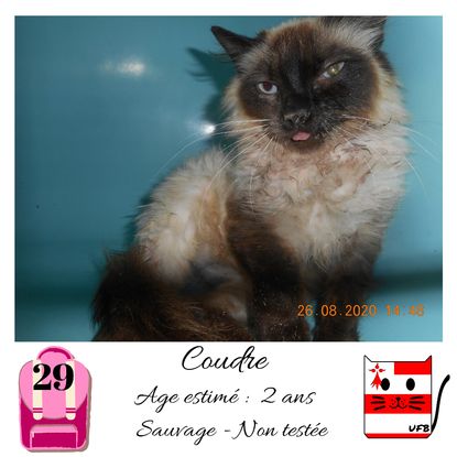 URGENCE EUTHANASIE ! Coudre est une femelle de 2 ans sauvageonne (un comportement normal en fourrière) qui vous attend dans une fourrière du 29. ATTENTION SORTIE AU PLUS TARD LE 04/09/2020 (avant euthanasie) ! Pour adopter, c'est facile : ➡️ On se rend sur la page facebook d'Urgence Fourrière de Bretagne (UFB) -> https://www.facebook.com/sosfourrieresbreizh/ ➡️ On vient en message privé sur la page UFB ➡️ On remplit le questionnaire ➡️ Si le questionnaire est validé, on se rend disponible pour la pré-visite ➡️ On se rend aussi disponible pour venir chercher le loulou en fourrière Les chats sortent de fourrière primo-vaccinés et identifiés. Restera à charge de l’adoptant le rappel de vaccin et la stérilisation qui est OBLIGATOIRE. Les femelles en fourrière ayant été trouvées dans la rue, il y a fort à parier que nombre d'entre elles en âge de l'être soient gestantes ... ---- A PROPOS D'URGENCE FOURRIERE DE BRETAGNE (UFB) Nous sommes un COLLECTIF d'ASSOCIATIONS DE PROTECTION ANIMALE (qui rassemble notamment Moustaches et Compagnie, Bêtes de Scène, les Pachas, Chats Libres de Berné, etc, etc....) Le BUT de ce collectif d'associations est donc de SORTIR ces animaux des fourrières surchargées en les faisant ADOPTER de manière LEGALE par des familles ou en leur trouvant des FAMILLES D'ACCUEIL lorsque des places en association se libèrent.