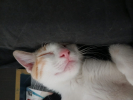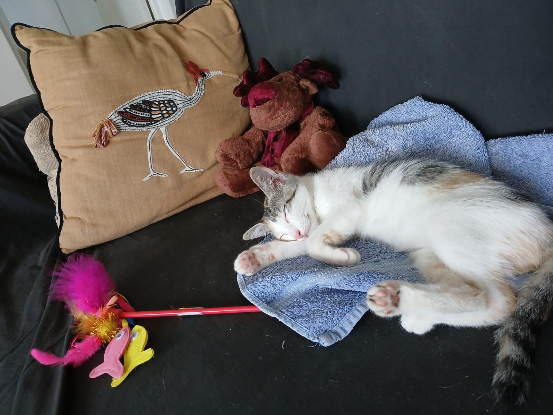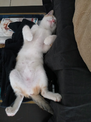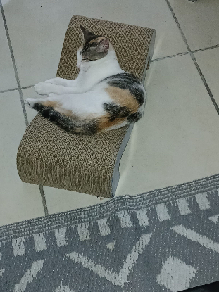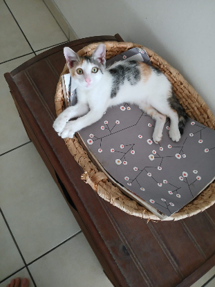 Trouvée dans un parking d'immeuble par une dame, elle hurlait parce qu'elle était affamée et était maigre. La dame et sa famille l'ont accueuillie et parrainée. Aujourd’hui prête à rejoindre sa famille pour la vie , très sociable avec les humains et ses congénères, elle est propre ,elle adore jouer , et de surcroît très affectueuse