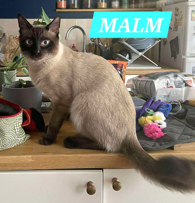 Malm est aussi un grand bavard : il n’hésite pas à miauler pour réclamer des câlins ou de l’attention. Très affectueux, il aime se blottir contre son humain pour dormir ou des caresses.