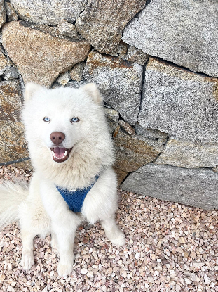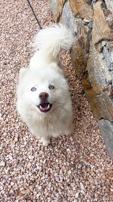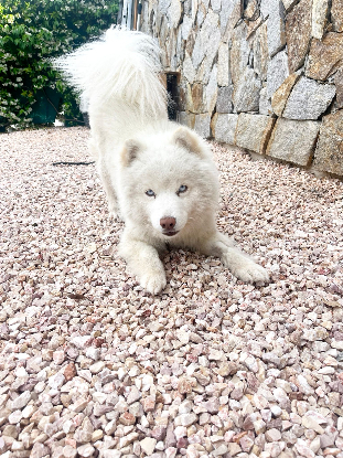 Volt est un chien Mâle, type Pomsky, blanc, identifié, stérilisé, vacciné,