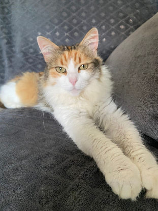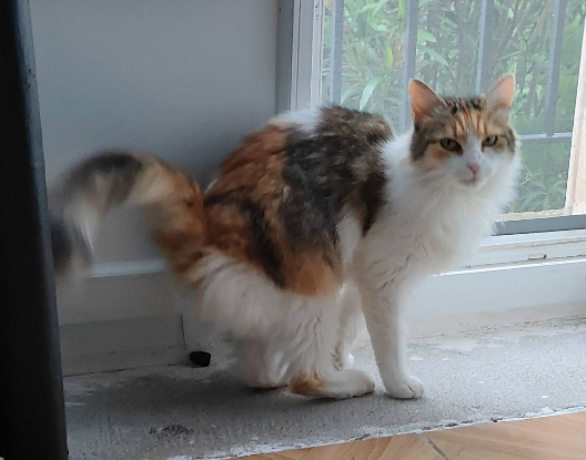 Voici Ginger, une magnifique minette de 2 ans, au pelage tricolore à poils longs et aux yeux verts envoûtants. Elle a tout d’un trésor caché : câline, joueuse, sociable, propre et parfaitement à l’aise avec ses congénères.
