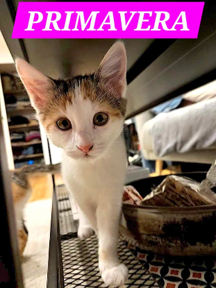 Primavera est un petite femelle tricolore d'environ trois mois, sauvée de la rue avec sa maman Primerose.