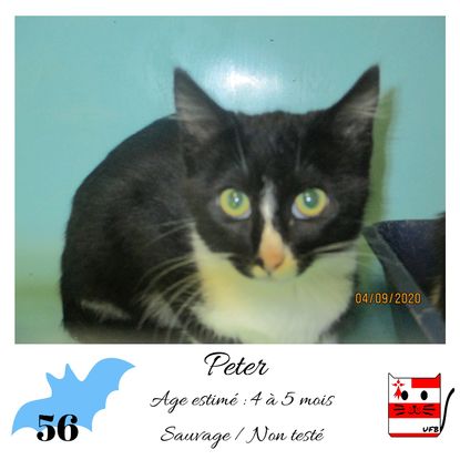 URGENCE EUTHANASIE ! Peter est un chaton de 3-4 mois sauvageon (un comportement normal en fourrière) qui vous attend dans une fourrière du 56. ATTENTION SORTIE AU PLUS TARD LE 11/09/2020 (avant euthanasie) ! Pour adopter, c'est facile : ➡️ On se rend sur la page facebook d'Urgence Fourrière de Bretagne (UFB) -> https://www.facebook.com/sosfourrieresbreizh/ ➡️ On vient en message privé sur la page UFB ➡️ On remplit le questionnaire ➡️ Si le questionnaire est validé, on se rend disponible pour la pré-visite ➡️ On se rend aussi disponible pour venir chercher le loulou en fourrière Les chats sortent de fourrière primo-vaccinés et identifiés. Restera à charge de l’adoptant le rappel de vaccin et la stérilisation qui est OBLIGATOIRE. Les femelles en fourrière ayant été trouvées dans la rue, il y a fort à parier que nombre d'entre elles en âge de l'être soient gestantes ... ---- A PROPOS D'URGENCE FOURRIERE DE BRETAGNE (UFB) Nous sommes un COLLECTIF d'ASSOCIATIONS DE PROTECTION ANIMALE (qui rassemble notamment Moustaches et Compagnie, Bêtes de Scène, les Pachas, Chats Libres de Berné, etc, etc....) Le BUT de ce collectif d'associations est donc de SORTIR ces animaux des fourrières surchargées en les faisant ADOPTER de manière LEGALE par des familles ou en leur trouvant des FAMILLES D'ACCUEIL lorsque des places en association se libèrent.