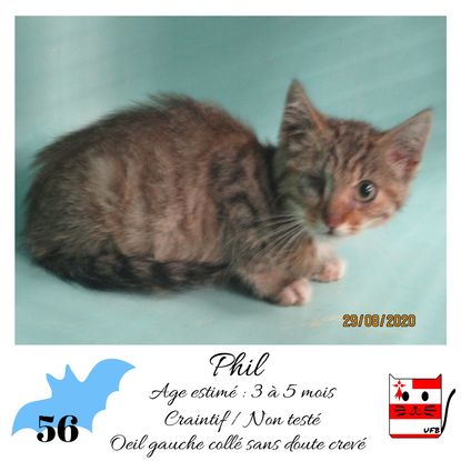 URGENCE EUTHANASIE ! Phil est un chaton de 3-5 mois craintif (un comportement normal en fourrière) qui vous attend dans une fourrière du 56. ATTENTION SORTIE AU PLUS TARD LE 11/09/2020 (avant euthanasie) ! Pour adopter, c'est facile : ➡️ On se rend sur la page facebook d'Urgence Fourrière de Bretagne (UFB) -> https://www.facebook.com/sosfourrieresbreizh/ ➡️ On vient en message privé sur la page UFB ➡️ On remplit le questionnaire ➡️ Si le questionnaire est validé, on se rend disponible pour la pré-visite ➡️ On se rend aussi disponible pour venir chercher le loulou en fourrière Les chats sortent de fourrière primo-vaccinés et identifiés. Restera à charge de l’adoptant le rappel de vaccin et la stérilisation qui est OBLIGATOIRE. Les femelles en fourrière ayant été trouvées dans la rue, il y a fort à parier que nombre d'entre elles en âge de l'être soient gestantes ... ---- A PROPOS D'URGENCE FOURRIERE DE BRETAGNE (UFB) Nous sommes un COLLECTIF d'ASSOCIATIONS DE PROTECTION ANIMALE (qui rassemble notamment Moustaches et Compagnie, Bêtes de Scène, les Pachas, Chats Libres de Berné, etc, etc....) Le BUT de ce collectif d'associations est donc de SORTIR ces animaux des fourrières surchargées en les faisant ADOPTER de manière LEGALE par des familles ou en leur trouvant des FAMILLES D'ACCUEIL lorsque des places en association se libèrent.