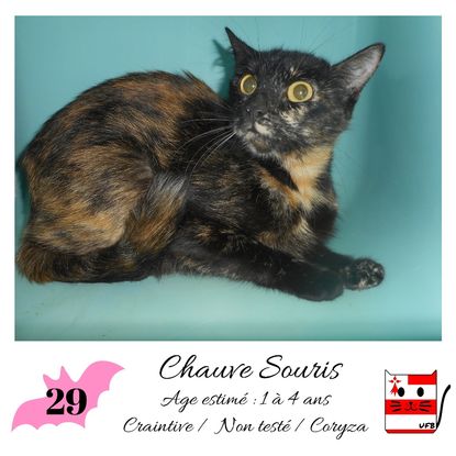 URGENCE EUTHANASIE ! Chauve-souris est une femelle de 1-4 ans craintive (un comportement normal en fourrière) qui vous attend dans une fourrière du 29. ATTENTION SORTIE AU PLUS TARD LE 11/09/2020 (avant euthanasie) ! Pour adopter, c'est facile : ➡️ On se rend sur la page facebook d'Urgence Fourrière de Bretagne (UFB) -> https://www.facebook.com/sosfourrieresbreizh/ ➡️ On vient en message privé sur la page UFB ➡️ On remplit le questionnaire ➡️ Si le questionnaire est validé, on se rend disponible pour la pré-visite ➡️ On se rend aussi disponible pour venir chercher le loulou en fourrière Les chats sortent de fourrière primo-vaccinés et identifiés. Restera à charge de l’adoptant le rappel de vaccin et la stérilisation qui est OBLIGATOIRE. Les femelles en fourrière ayant été trouvées dans la rue, il y a fort à parier que nombre d'entre elles en âge de l'être soient gestantes ... ---- A PROPOS D'URGENCE FOURRIERE DE BRETAGNE (UFB) Nous sommes un COLLECTIF d'ASSOCIATIONS DE PROTECTION ANIMALE (qui rassemble notamment Moustaches et Compagnie, Bêtes de Scène, les Pachas, Chats Libres de Berné, etc, etc....) Le BUT de ce collectif d'associations est donc de SORTIR ces animaux des fourrières surchargées en les faisant ADOPTER de manière LEGALE par des familles ou en leur trouvant des FAMILLES D'ACCUEIL lorsque des places en association se libèrent.