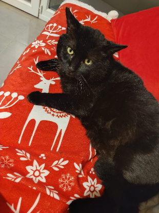 Autrement, c’est un pot de colle doublé d’une machine qui ronronne dès qu’on le touche. Il adore dormir sur les humains et dort avec la FA ou son fils la nuit. Il n’est même pas intéressé par le jeu parce que dès qu’il est à proximité d’un humain il vient mettre des coups de tête pour réclamer des caresses et se mettre sur le dos pour qu’on lui gratouille le ventre.