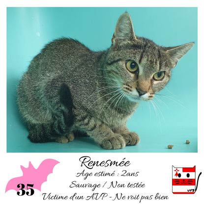 URGENCE EUTHANASIE ! Renesmée est une femelle de 2 ans sauvageonne (un comportement normal en fourrière) qui vous attend dans une fourrière du 35. ATTENTION SORTIE AU PLUS TARD LE 11/09/2020 (avant euthanasie) ! Pour adopter, c'est facile : ➡️ On se rend sur la page facebook d'Urgence Fourrière de Bretagne (UFB) -> https://www.facebook.com/sosfourrieresbreizh/ ➡️ On vient en message privé sur la page UFB ➡️ On remplit le questionnaire ➡️ Si le questionnaire est validé, on se rend disponible pour la pré-visite ➡️ On se rend aussi disponible pour venir chercher le loulou en fourrière Les chats sortent de fourrière primo-vaccinés et identifiés. Restera à charge de l’adoptant le rappel de vaccin et la stérilisation qui est OBLIGATOIRE. Les femelles en fourrière ayant été trouvées dans la rue, il y a fort à parier que nombre d'entre elles en âge de l'être soient gestantes ... ---- A PROPOS D'URGENCE FOURRIERE DE BRETAGNE (UFB) Nous sommes un COLLECTIF d'ASSOCIATIONS DE PROTECTION ANIMALE (qui rassemble notamment Moustaches et Compagnie, Bêtes de Scène, les Pachas, Chats Libres de Berné, etc, etc....) Le BUT de ce collectif d'associations est donc de SORTIR ces animaux des fourrières surchargées en les faisant ADOPTER de manière LEGALE par des familles ou en leur trouvant des FAMILLES D'ACCUEIL lorsque des places en association se libèrent.