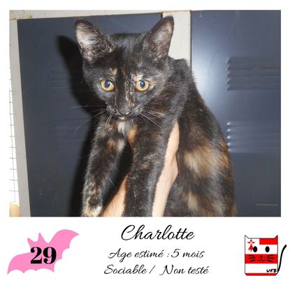 URGENCE EUTHANASIE ! Charlotte est une femelle de 5 mois sociable qui vous attend dans une fourrière du 29. ATTENTION SORTIE AU PLUS TARD LE 11/09/2020 (avant euthanasie) ! Pour adopter, c'est facile : ➡️ On se rend sur la page facebook d'Urgence Fourrière de Bretagne (UFB) -> https://www.facebook.com/sosfourrieresbreizh/ ➡️ On vient en message privé sur la page UFB ➡️ On remplit le questionnaire ➡️ Si le questionnaire est validé, on se rend disponible pour la pré-visite ➡️ On se rend aussi disponible pour venir chercher le loulou en fourrière Les chats sortent de fourrière primo-vaccinés et identifiés. Restera à charge de l’adoptant le rappel de vaccin et la stérilisation qui est OBLIGATOIRE. Les femelles en fourrière ayant été trouvées dans la rue, il y a fort à parier que nombre d'entre elles en âge de l'être soient gestantes ... ---- A PROPOS D'URGENCE FOURRIERE DE BRETAGNE (UFB) Nous sommes un COLLECTIF d'ASSOCIATIONS DE PROTECTION ANIMALE (qui rassemble notamment Moustaches et Compagnie, Bêtes de Scène, les Pachas, Chats Libres de Berné, etc, etc....) Le BUT de ce collectif d'associations est donc de SORTIR ces animaux des fourrières surchargées en les faisant ADOPTER de manière LEGALE par des familles ou en leur trouvant des FAMILLES D'ACCUEIL lorsque des places en association se libèrent.