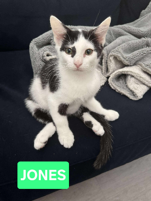 Jones est un jeune chat noir et blanc au caractère aussi attachant que joueur. Curieux de tout, il adore explorer son environnement, observer ce qui se passe autour de lui et partir à l’aventure avec ses jouets préférés, surtout les petites balles et peluches.