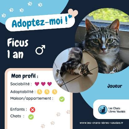 Pour Ficus nous cherchons une famille en maison ou appartement avec balcon. On sent bien que Ficus aimerait profiter d’un coin d’extérieur, notamment pour jouer ! Ficus est compatible avec ses congénères chats ! Aussi Ficus ne pourra pas vivre avec des enfants, car il a besoin d’un environnement calme et routinier pour se sentir bien. Enfin, Ficus est autonome en journée, mais vous réclamera quand même beaucoup d’attention !