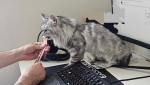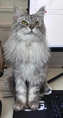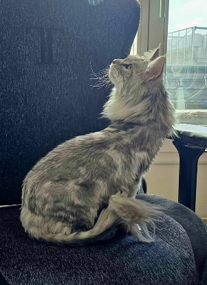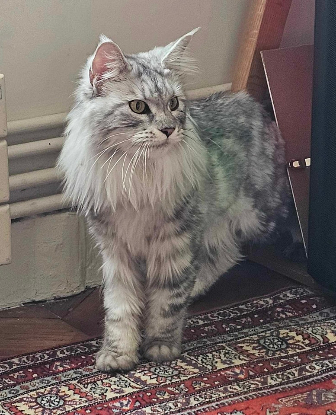 Son beau poil blue silver tabby ayant sans doute été emmêlé, elle a été tondue assez récemment (sauf la tête !) et n’a pas encore retrouvé sa belle fourrure à poils longs.