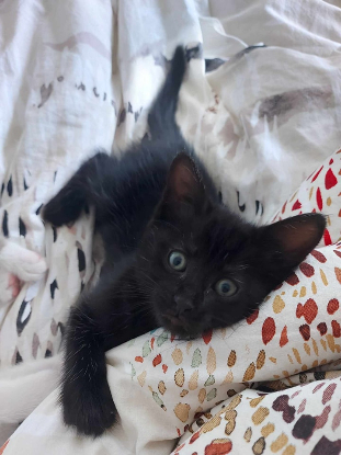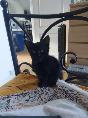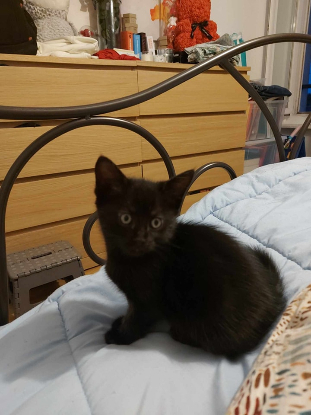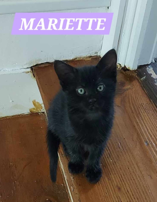 Mariette est une petite chatonne pleine de tendresse, aussi craquante que sociable. Elle tient beaucoup de sa maman Philomène, avec son pelage majoritairement noir, subtilement parsemé de quelques poils blancs sur ses pattes, qui lui donnent un charme discret et élégant.