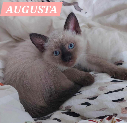 Côté personnalité, Augusta est très joueuse avec ses sœurs et adore participer aux séances de jeux collectifs. Mais quand il s’agit d’interagir avec les humains… madame fait ses choix ! Elle a un petit côté princesse assumé : elle sélectionne soigneusement les personnes avec qui elle veut partager son affection. (Elle est d’ailleurs tout à fait capable d’ignorer quelqu’un avec un regard digne d’une impératrice… sauf pour aller se blottir dans les jambes de Monsieur).