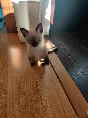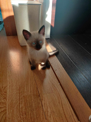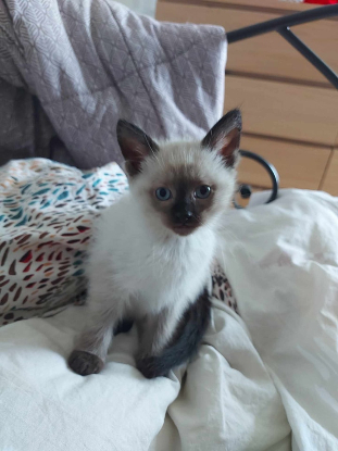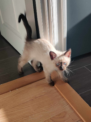 Sa maman Philomène, elle ne lui ressemble pas du tout physiquement. Elle a hérité d’un magnifique pelage typé siamois : blanche et beige, avec des oreilles, une queue, un museau et des pattes plus foncées, qui mettent en valeur ses superbes yeux bleus. Un vrai charme royal !