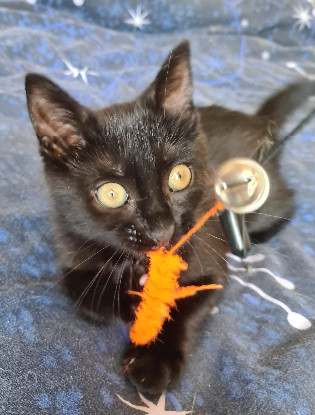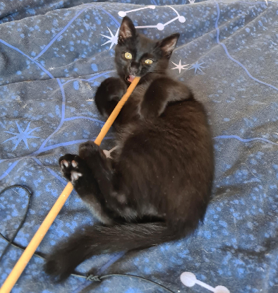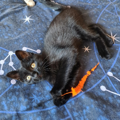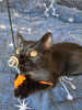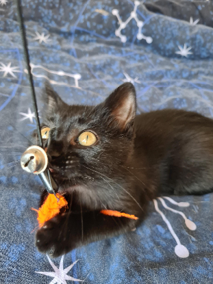Arsouille est une minette très joueuse ( mais un peu mauvaise joueuse... elle rale si elle ne gagne pas contre les autres chats de sa famille d'accueil), à l'aise en toute circonstances et avec tout le monde et très gourmande.