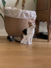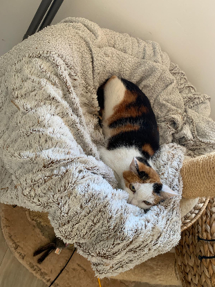 Aloé est un petit format, un mini chat tout mignon et discret qui a beaucoup d’amour à donner. Au calme dans son panier elle adore qu’on vienne la gratouiller. Et parfois elle apparaît toute espiègle dans le salon , ses grandes oreilles en alerte pour venir jouer avec vous à ses jeux préférés
