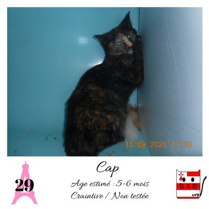 URGENCE EUTHANASIE ! Cap est une femelle de 5-6 mois craintive (un comportement normal en fourrière) qui vous attend dans une fourrière du 29. ATTENTION SORTIE AU PLUS TARD LE 18/09/2020 (avant euthanasie) ! Pour adopter, c'est facile : ➡️ On se rend sur la page facebook d'Urgence Fourrière de Bretagne (UFB) -> https://www.facebook.com/sosfourrieresbreizh/ ➡️ On vient en message privé sur la page UFB ➡️ On remplit le questionnaire ➡️ Si le questionnaire est validé, on se rend disponible pour la pré-visite ➡️ On se rend aussi disponible pour venir chercher le loulou en fourrière Les chats sortent de fourrière primo-vaccinés et identifiés. Restera à charge de l’adoptant le rappel de vaccin et la stérilisation qui est OBLIGATOIRE. Les femelles en fourrière ayant été trouvées dans la rue, il y a fort à parier que nombre d'entre elles en âge de l'être soient gestantes ... ---- A PROPOS D'URGENCE FOURRIERE DE BRETAGNE (UFB) Nous sommes un COLLECTIF d'ASSOCIATIONS DE PROTECTION ANIMALE (qui rassemble notamment Moustaches et Compagnie, Bêtes de Scène, les Pachas, Chats Libres de Berné, etc, etc....) Le BUT de ce collectif d'associations est donc de SORTIR ces animaux des fourrières surchargées en les faisant ADOPTER de manière LEGALE par des familles ou en leur trouvant des FAMILLES D'ACCUEIL lorsque des places en association se libèrent.