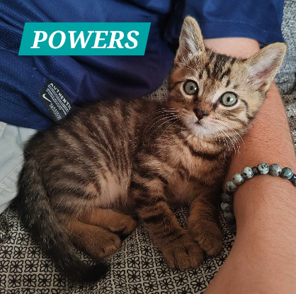 Powers a été retrouvé dans un jardin, mais ce n’est pas un chat craintif — bien au contraire : c’est un vrai pot de colle ! C’est la boule d’énergie du duo