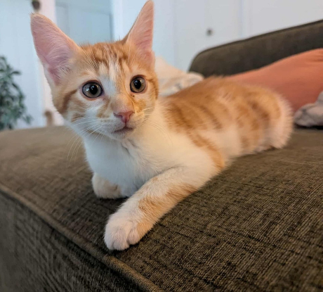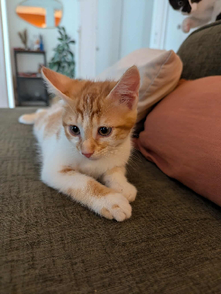 Petit minet roux et blanc au tempérament doux, plus temeraire que sa copine mais tout aussi délicat. Il reste sur la réserve avec les humains qu’il ne connaît pas encore, sans jamais montrer la moindre agressivité.