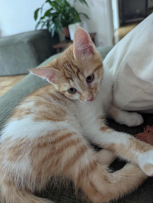 C’est un grand gourmand, ce qui aide à créer le lien ! Il commence à se détendre, apprécie les interactions tranquilles, mais surtout veut explorer et JOUER dans son environnement. Même avec un autre gros chat méfiant dans les parages, il mène sa vie d'explorateur sans s'en soucier.