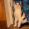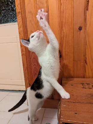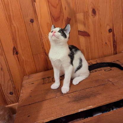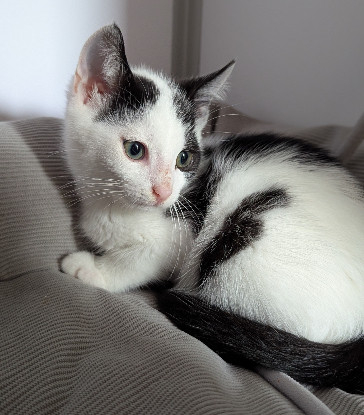 Tout d'abord, je suis beau ! Et oui, avec un mon pelage noir et blanc et mes yeux émeraudes, je suis très élégant. J'ai de grandes patounes, quand je serai adulte je serai probablement un très grand chat, majestueux !