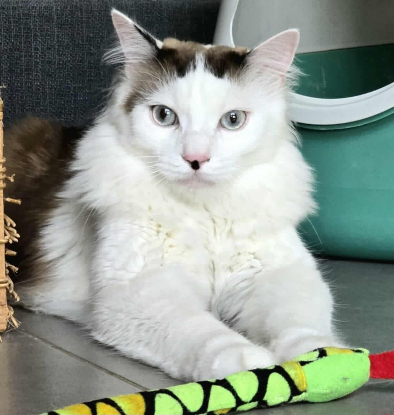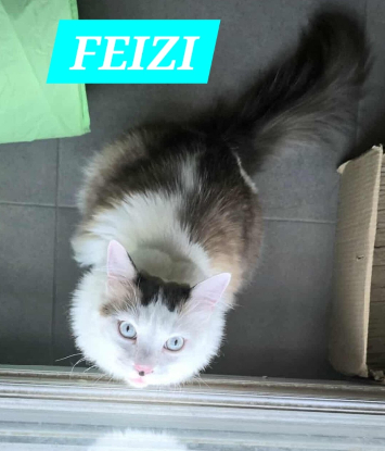 Feizi est un jeune chat majestueux au pelage blanc et brun, avec de superbes yeux bleu-vert et une petite tache sur le nez.