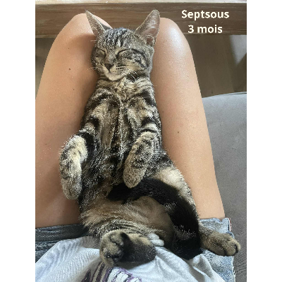 Encore un peu timide, Septsous est une petite boule de poils calme, gentille et joueuse. Elle découvre le monde à son rythme, avec curiosité et délicatesse.