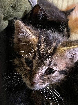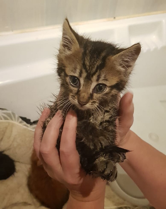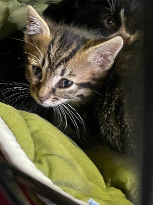 Flow est un adorable chaton tigré d'environ 1,5 mois, récupéré avec ses 4 frères et soeurs dans un terrain proche des maisons.