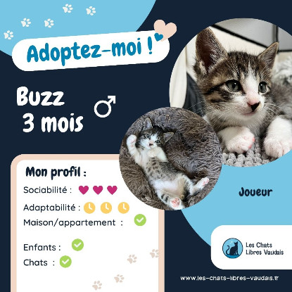Le petit Buzz est un chaton très craquant ! Avec son regard malicieux, il ne manque jamais une occasion de faire la course, grimper, jouer et s’amuser comme un petit fou. C’est un chaton plein de vie, qui apporte de la joie dans le foyer. Buzz est aussi très fort pour communiquer, il sait très bien se faire comprendre. Avec lui, on vous promet une relation forte et surtout très complice.