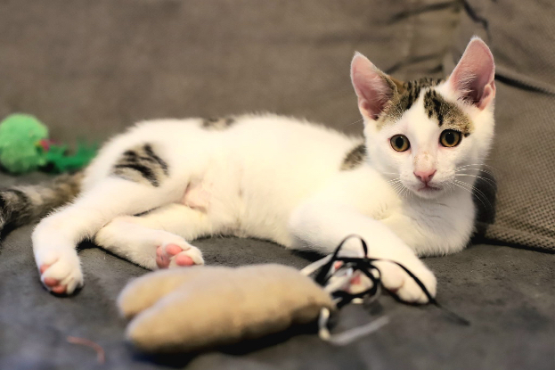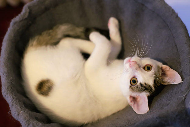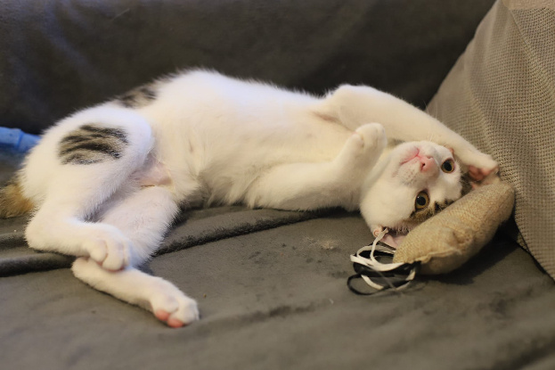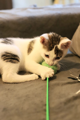Avec mes frère et sœur, nous sommes de vrais petits bouts de vie. On adore jouer tous les trois, courir après des ficelles, explorer partout et se cacher pour mieux se sauter dessus. Mais une fois qu’on a bien joué, on devient les plus câlins du monde. J’adore venir me blottir contre un humain, surtout pour dormir, on aime bien partager le lit, c’est plus doux et plus chaud.