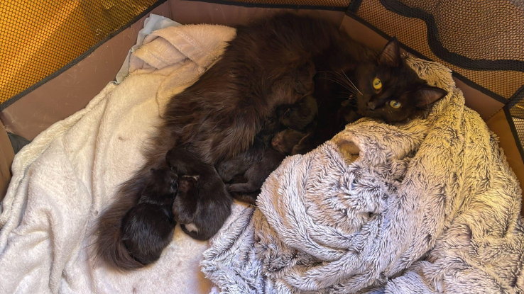 Il était une fois Symphonie, une jeune mère d'une portée de 7 chatons. Elle a été trouvée dans un carton collé à une poubelle avec ses chatons qui n'avaient que quelques jours. Elle a été recueillie avec ses chatons au sein d'une même famille d'accueil.
