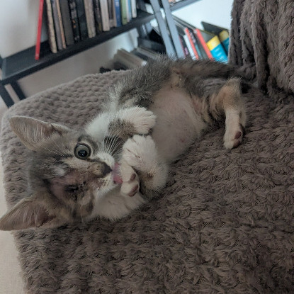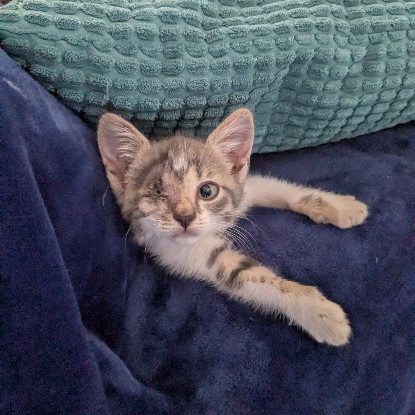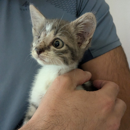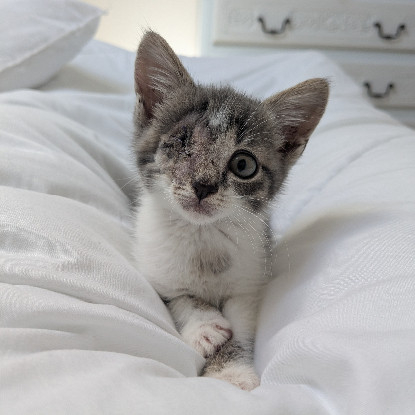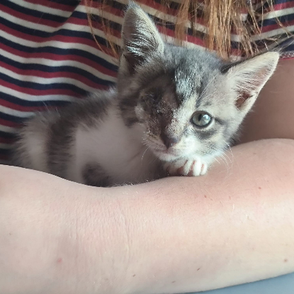 Je suis un adorable chaton d'à peine deux mois. J'ai été retrouvé par les membres de l'association dans un mauvais état. On a dû m'enlever un œil. Depuis, tout va mieux. Mon œil est bien cicatrisé et ne nécessite aucun soin. Cet œil en moins n'est pas handicapant pour moi, je me suis adapté et je vis normalement. Je suis en pleine forme et j'attends désormais de rencontrer ma future famille !