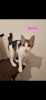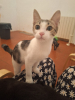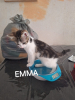 Emma est un petite femelle au pelage blanc et tigré, très très joueuse et en demande d'attention.