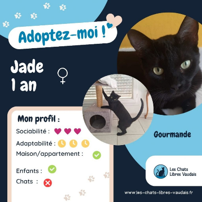 Jade est une jeune panthère noire, âgée d’environ 1 an, et très bien dans ses pattounes. Jade c’est une boule d’amour, elle adore la présence humaine. Elle suit son humain partout dans la maison, soit pour observer, soit pour participer aux activités quotidiennes ! Avec Jade il faudra s’attendre à avoir un petit pot de colle à la maison. Jade est très affectueuse, mais aussi très vive et joueuse. Elle a le jeu dans l’âme, et ne se lasse jamais d’une partie de course poursuite avec une petite balle dans l’appartement.