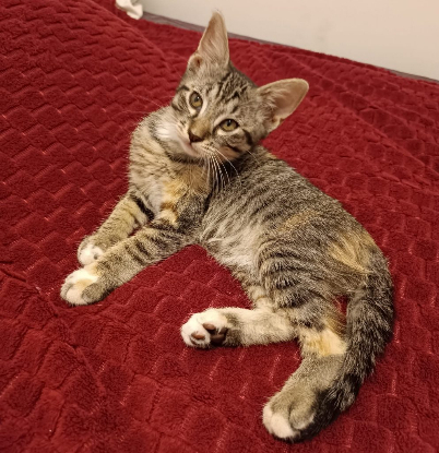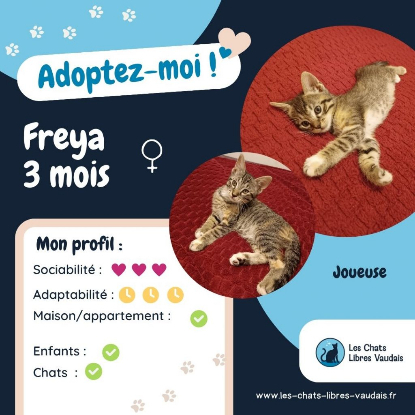 La petite Freya n’a que 3 mois, mais c’est déjà une minette extrêmement intelligente et curieuse. Freya c’est la joie incarnée : toujours prête pour une partie de jeu, toujours dans les parages à suivre son humaine dans la maison, toujours très heureuse d’avoir des gratouilles sur le ventre. Elle est très affectueuse, et n’est pas timide à l’idée de montrer son amour à ses humains. Freya c’est donc une petite chatoune idéale, qui n’a qu’une hâte : qu’une famille lui ouvre son coeur.