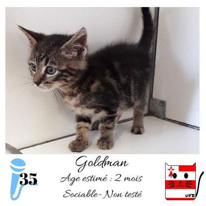 URGENCE EUTHANASIE ! Goldman est un mâle de 2 mois sociable qui vous attend dans une fourrière du 35. ATTENTION SORTIE AU PLUS TARD LE 25/09/2020 (avant euthanasie) ! Pour adopter, c'est facile : ➡️ On se rend sur la page facebook d'Urgence Fourrière de Bretagne (UFB) -> https://www.facebook.com/sosfourrieresbreizh/ ➡️ On vient en message privé sur la page UFB ➡️ On remplit le questionnaire ➡️ Si le questionnaire est validé, on se rend disponible pour la pré-visite ➡️ On se rend aussi disponible pour venir chercher le loulou en fourrière Les chats sortent de fourrière primo-vaccinés et identifiés. Restera à charge de l’adoptant le rappel de vaccin et la stérilisation qui est OBLIGATOIRE. Les femelles en fourrière ayant été trouvées dans la rue, il y a fort à parier que nombre d'entre elles en âge de l'être soient gestantes ... ---- A PROPOS D'URGENCE FOURRIERE DE BRETAGNE (UFB) Nous sommes un COLLECTIF d'ASSOCIATIONS DE PROTECTION ANIMALE (qui rassemble notamment Moustaches et Compagnie, Bêtes de Scène, les Pachas, Chats Libres de Berné, etc, etc....) Le BUT de ce collectif d'associations est donc de SORTIR ces animaux des fourrières surchargées en les faisant ADOPTER de manière LEGALE par des familles ou en leur trouvant des FAMILLES D'ACCUEIL lorsque des places en association se libèrent.