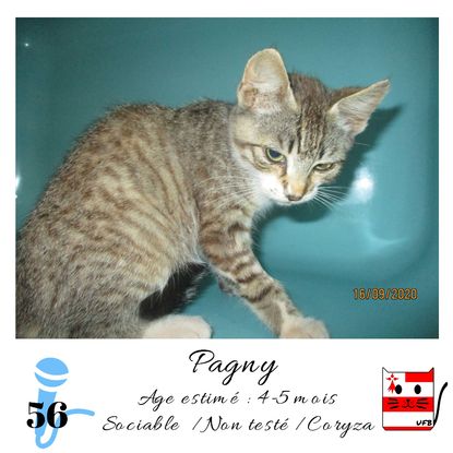 URGENCE EUTHANASIE ! Pagny est un mâle de 4-5 mois sociable qui vous attend dans une fourrière du 56. ATTENTION SORTIE AU PLUS TARD LE 25/09/2020 (avant euthanasie) ! Pour adopter, c'est facile : ➡️ On se rend sur la page facebook d'Urgence Fourrière de Bretagne (UFB) -> https://www.facebook.com/sosfourrieresbreizh/ ➡️ On vient en message privé sur la page UFB ➡️ On remplit le questionnaire ➡️ Si le questionnaire est validé, on se rend disponible pour la pré-visite ➡️ On se rend aussi disponible pour venir chercher le loulou en fourrière Les chats sortent de fourrière primo-vaccinés et identifiés. Restera à charge de l’adoptant le rappel de vaccin et la stérilisation qui est OBLIGATOIRE. Les femelles en fourrière ayant été trouvées dans la rue, il y a fort à parier que nombre d'entre elles en âge de l'être soient gestantes ... ---- A PROPOS D'URGENCE FOURRIERE DE BRETAGNE (UFB) Nous sommes un COLLECTIF d'ASSOCIATIONS DE PROTECTION ANIMALE (qui rassemble notamment Moustaches et Compagnie, Bêtes de Scène, les Pachas, Chats Libres de Berné, etc, etc....) Le BUT de ce collectif d'associations est donc de SORTIR ces animaux des fourrières surchargées en les faisant ADOPTER de manière LEGALE par des familles ou en leur trouvant des FAMILLES D'ACCUEIL lorsque des places en association se libèrent.