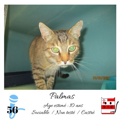 URGENCE EUTHANASIE ! Palmas est un mâle de 10 ans sociable qui vous attend dans une fourrière du 56. ATTENTION SORTIE AU PLUS TARD LE 25/09/2020 (avant euthanasie) ! Pour adopter, c'est facile : ➡️ On se rend sur la page facebook d'Urgence Fourrière de Bretagne (UFB) -> https://www.facebook.com/sosfourrieresbreizh/ ➡️ On vient en message privé sur la page UFB ➡️ On remplit le questionnaire ➡️ Si le questionnaire est validé, on se rend disponible pour la pré-visite ➡️ On se rend aussi disponible pour venir chercher le loulou en fourrière Les chats sortent de fourrière primo-vaccinés et identifiés. Restera à charge de l’adoptant le rappel de vaccin et la stérilisation qui est OBLIGATOIRE. Les femelles en fourrière ayant été trouvées dans la rue, il y a fort à parier que nombre d'entre elles en âge de l'être soient gestantes ... ---- A PROPOS D'URGENCE FOURRIERE DE BRETAGNE (UFB) Nous sommes un COLLECTIF d'ASSOCIATIONS DE PROTECTION ANIMALE (qui rassemble notamment Moustaches et Compagnie, Bêtes de Scène, les Pachas, Chats Libres de Berné, etc, etc....) Le BUT de ce collectif d'associations est donc de SORTIR ces animaux des fourrières surchargées en les faisant ADOPTER de manière LEGALE par des familles ou en leur trouvant des FAMILLES D'ACCUEIL lorsque des places en association se libèrent.