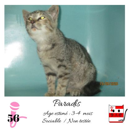 URGENCE EUTHANASIE ! Paradis est une femelle de 3-4 mois sociable qui vous attend dans une fourrière du 56. ATTENTION SORTIE AU PLUS TARD LE 25/09/2020 (avant euthanasie) ! Pour adopter, c'est facile : ➡️ On se rend sur la page facebook d'Urgence Fourrière de Bretagne (UFB) -> https://www.facebook.com/sosfourrieresbreizh/ ➡️ On vient en message privé sur la page UFB ➡️ On remplit le questionnaire ➡️ Si le questionnaire est validé, on se rend disponible pour la pré-visite ➡️ On se rend aussi disponible pour venir chercher le loulou en fourrière Les chats sortent de fourrière primo-vaccinés et identifiés. Restera à charge de l’adoptant le rappel de vaccin et la stérilisation qui est OBLIGATOIRE. Les femelles en fourrière ayant été trouvées dans la rue, il y a fort à parier que nombre d'entre elles en âge de l'être soient gestantes ... ---- A PROPOS D'URGENCE FOURRIERE DE BRETAGNE (UFB) Nous sommes un COLLECTIF d'ASSOCIATIONS DE PROTECTION ANIMALE (qui rassemble notamment Moustaches et Compagnie, Bêtes de Scène, les Pachas, Chats Libres de Berné, etc, etc....) Le BUT de ce collectif d'associations est donc de SORTIR ces animaux des fourrières surchargées en les faisant ADOPTER de manière LEGALE par des familles ou en leur trouvant des FAMILLES D'ACCUEIL lorsque des places en association se libèrent.