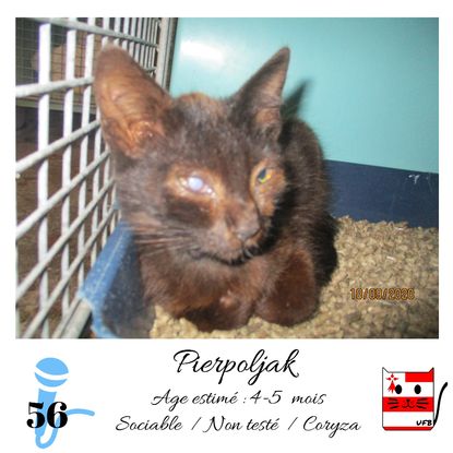 URGENCE EUTHANASIE ! Pierpoljak est un mâle de 4-5 mois sociable qui vous attend dans une fourrière du 56. ATTENTION SORTIE AU PLUS TARD LE 25/09/2020 (avant euthanasie) ! Pour adopter, c'est facile : ➡️ On se rend sur la page facebook d'Urgence Fourrière de Bretagne (UFB) -> https://www.facebook.com/sosfourrieresbreizh/ ➡️ On vient en message privé sur la page UFB ➡️ On remplit le questionnaire ➡️ Si le questionnaire est validé, on se rend disponible pour la pré-visite ➡️ On se rend aussi disponible pour venir chercher le loulou en fourrière Les chats sortent de fourrière primo-vaccinés et identifiés. Restera à charge de l’adoptant le rappel de vaccin et la stérilisation qui est OBLIGATOIRE. Les femelles en fourrière ayant été trouvées dans la rue, il y a fort à parier que nombre d'entre elles en âge de l'être soient gestantes ... ---- A PROPOS D'URGENCE FOURRIERE DE BRETAGNE (UFB) Nous sommes un COLLECTIF d'ASSOCIATIONS DE PROTECTION ANIMALE (qui rassemble notamment Moustaches et Compagnie, Bêtes de Scène, les Pachas, Chats Libres de Berné, etc, etc....) Le BUT de ce collectif d'associations est donc de SORTIR ces animaux des fourrières surchargées en les faisant ADOPTER de manière LEGALE par des familles ou en leur trouvant des FAMILLES D'ACCUEIL lorsque des places en association se libèrent.