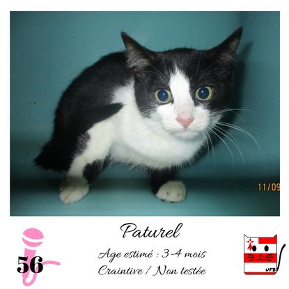 URGENCE EUTHANASIE ! Paturel est une femelle de 3-4 mois craintive (un comportement normal en fourrière) qui vous attend dans une fourrière du 56. ATTENTION SORTIE AU PLUS TARD LE 25/09/2020 (avant euthanasie) ! Pour adopter, c'est facile : ➡️ On se rend sur la page facebook d'Urgence Fourrière de Bretagne (UFB) -> https://www.facebook.com/sosfourrieresbreizh/ ➡️ On vient en message privé sur la page UFB ➡️ On remplit le questionnaire ➡️ Si le questionnaire est validé, on se rend disponible pour la pré-visite ➡️ On se rend aussi disponible pour venir chercher le loulou en fourrière Les chats sortent de fourrière primo-vaccinés et identifiés. Restera à charge de l’adoptant le rappel de vaccin et la stérilisation qui est OBLIGATOIRE. Les femelles en fourrière ayant été trouvées dans la rue, il y a fort à parier que nombre d'entre elles en âge de l'être soient gestantes ... ---- A PROPOS D'URGENCE FOURRIERE DE BRETAGNE (UFB) Nous sommes un COLLECTIF d'ASSOCIATIONS DE PROTECTION ANIMALE (qui rassemble notamment Moustaches et Compagnie, Bêtes de Scène, les Pachas, Chats Libres de Berné, etc, etc....) Le BUT de ce collectif d'associations est donc de SORTIR ces animaux des fourrières surchargées en les faisant ADOPTER de manière LEGALE par des familles ou en leur trouvant des FAMILLES D'ACCUEIL lorsque des places en association se libèrent.