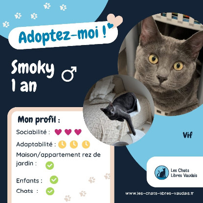 Smoky est un très beau chat, extrêmement gentil et attachant. Smoky aime tous les humains, grand comme petit, c’est un chat de nature très sociable. Plus il y a d’humain avec lui, et plus il est content. C’est un chat pot de colle, qui ne loupera jamais une occasion de passer du temps avec son humain (pour faire la sieste, l’observer, jouer avec lui, etc.). Smoky n’a que 1 an, il est donc très vif, très joueur. C’est un chasseur hors pair, et aussi un professionnel du ronron! Smoky a vraiment tout pour plaire : câlin, joueur, pot de colle.