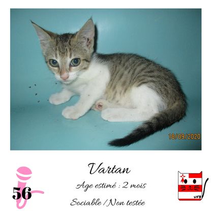 URGENCE EUTHANASIE ! Vartan est une femelle de 2 mois sociable qui vous attend dans une fourrière du 56. ATTENTION SORTIE AU PLUS TARD LE 25/09/2020 (avant euthanasie) ! Pour adopter, c'est facile : ➡️ On se rend sur la page facebook d'Urgence Fourrière de Bretagne (UFB) -> https://www.facebook.com/sosfourrieresbreizh/ ➡️ On vient en message privé sur la page UFB ➡️ On remplit le questionnaire ➡️ Si le questionnaire est validé, on se rend disponible pour la pré-visite ➡️ On se rend aussi disponible pour venir chercher le loulou en fourrière Les chats sortent de fourrière primo-vaccinés et identifiés. Restera à charge de l’adoptant le rappel de vaccin et la stérilisation qui est OBLIGATOIRE. Les femelles en fourrière ayant été trouvées dans la rue, il y a fort à parier que nombre d'entre elles en âge de l'être soient gestantes ... ---- A PROPOS D'URGENCE FOURRIERE DE BRETAGNE (UFB) Nous sommes un COLLECTIF d'ASSOCIATIONS DE PROTECTION ANIMALE (qui rassemble notamment Moustaches et Compagnie, Bêtes de Scène, les Pachas, Chats Libres de Berné, etc, etc....) Le BUT de ce collectif d'associations est donc de SORTIR ces animaux des fourrières surchargées en les faisant ADOPTER de manière LEGALE par des familles ou en leur trouvant des FAMILLES D'ACCUEIL lorsque des places en association se libèrent.