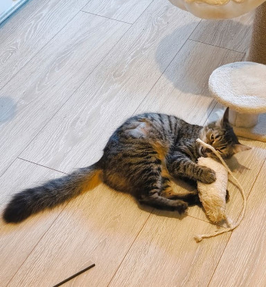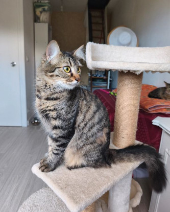 Je me suis bien adaptée à ma nouvelle famille. La présence de ma compagne Inari m'a rassurée. Je suis curieuse. Tout me semble nouveau : une porte ouverte, un autre chat, regarder par la fenêtre. Parfois j'ai peur, le balai ou le téléphone m'effrayait. Maintenant ça va. J'aime bien les caresses et je viens facilement en chercher. Je suis une petite gourmande. Ma compagne Inari ne finit pas toujours sa pâtée. Mais je suis là. Je finis à sa place. Nous sommes complémentaires.