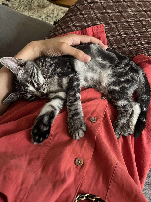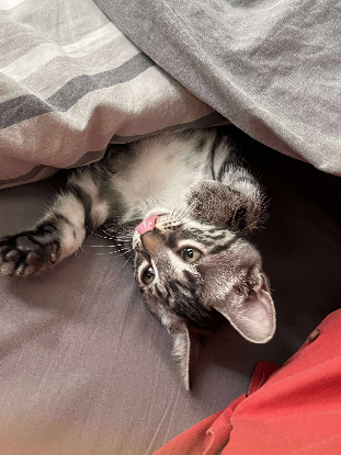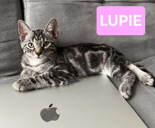 La plus petite de la bande, c’est Lupie. Au départ timide, elle a besoin d’un temps d’adaptation pour se faire à son nouvel environnement. Mais une fois celui ci passé, Lupie devient extrêmement câline : elle vient dormir contre vous, sur vous, dans les bras. Elle aime l’attention et les moments en compagnie de son humain. Bien que ce soit la plus petite de la fratrie, elle sort de la mêlée dès qu’elle entend le bruit de son jeu préféré : le grelot de la canne à pêche ! À ce moment là plus une once de timidité ne reste et elle se jette corps et âme dans le tumulte, jusqu’à voler la vedette. Une famille patiente et sans enfants serait l’idéal pour qu’elle puisse s’épanouir, ainsi qu’un copain chat bien sûr car elle aime beaucoup leur compagnie et la recherche activement.