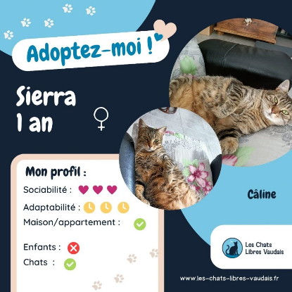 Sierra est toute jeune, et est toute rayonnante ! Sierra adore jouer, c’est une super bonne chasseuse de mouches et d’insectes. Sierra recherche aussi beaucoup la présence humaine. Elle ne loupera jamais une occasion de faire la sieste à côté de vous, ou bien de réclamer sa ration de gratouilles et câlins. Nous ne trouvons aucun défaut à Sierra, c’est une super minette qui mérite une famille tout aussi géniale qu’elle !