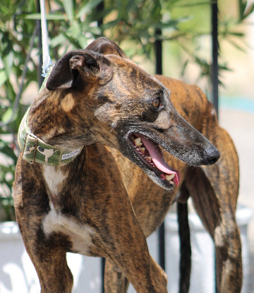Raton, superbe Galgo mâle au pelage bringé remarquable, bientôt 5 ans, attend une famille aimante. De petite taille pour un mâle lévrier, il est calme, sociable et très attachant.