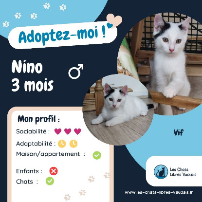 Nino est une petite boule de poil discrète, mais très mignon. Nino est très vif, et il est surprenant avec ses mimiques : il est surnommé Nino le T-Rex car il aime se mettre sur ses deux pattes arrière et attraper des choses avec ses deux patounes avant. Nino est plein de surprise, et d’amour. Il comblera de joie sa famille adoptive.
